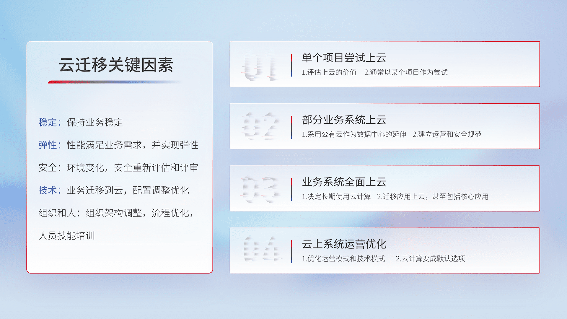 结合实际业务,,,,从规划设计、、、云平台选型、、云原生改造、、数据迁移、、、集成交付,,迁移全过程为客户识别最佳上云路径,,,做好风险识别管理,,设计网络架构、、、身份权限、、、、安全审计合规、、、操作审计、、日志审计、、监控告警策略、、多站点容灾设计等,,对云上基础设施进行整体规划,,,,提升IT治理水平,,,,以满足弹性、、、高可用、、、高性能的需求。。。