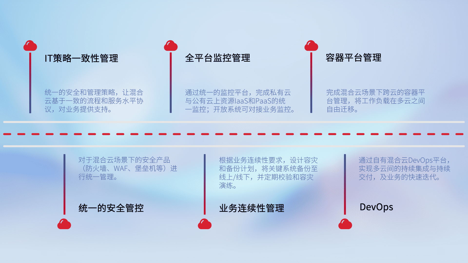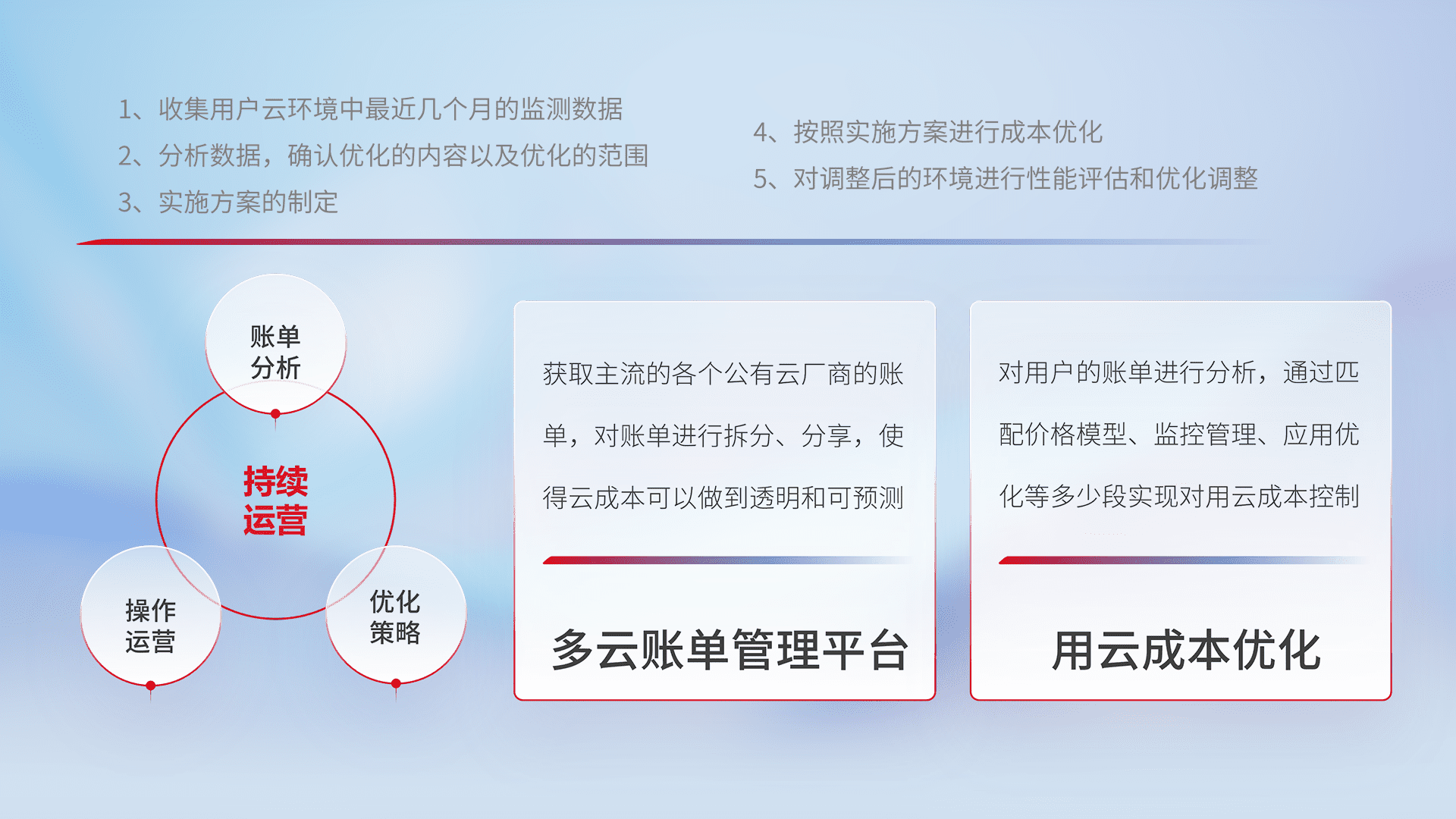 通过多云纳管,,以统一的资源数据模型把客户的云资源进行抽象和封装,,进而实现对多云资源的统一操作,,,保障云资源管理的可靠性、、、、稳定性与可用性。。量身定制化运维内容,,,配置、、、开发运维、、、补丁管理、、、、备份、、监控、、认证和访问管理、、、、审计和日常巡检等,,保障在用云过程中的可靠度,,,,稳定度以及高可用率。。